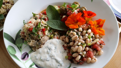 Tabouleh mit veganer Kräuter-Minz-Joghurt - Soße und griechischem Bohnensalat | ||